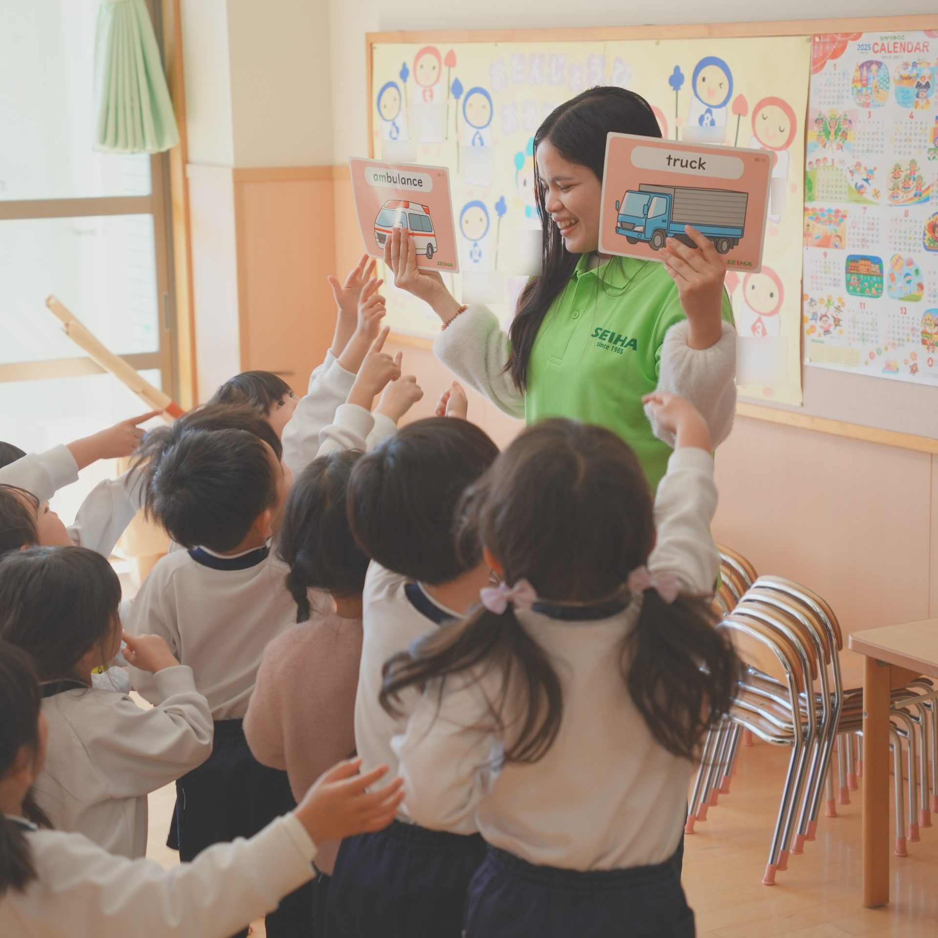小学校の英語教育が必修化となったことで、幼稚園の頃から英語に慣れ親しんで貰おうと、「セイハ英語学院」の外国人講師と日本人講師が満3歳児クラスより保育時間中に週1回の英語の指導を行っています。カードを使ったり、音楽に合わせて体を動かしたりして楽しく学んでいきます。