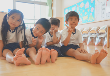 当園では、土踏まずの形成と外反母趾予防の健康作りの為に、園舎内でのはだし生活を奨めています。