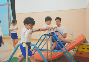 体操の能力の向上はもちろん、出来ないではなくやってみるといった「挑戦の心」、みんなで準備をしたり片付けをしたりといった「協調性の心」、スモールステップ指導で成功体験を積み重ねていく「努力の心」の3つの心を褒める・励ます指導で育んでいきます。
