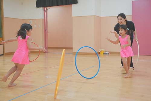 リボンやボールなど様々な手具と一緒に音楽に合わせて身体を動かす楽しさを体感して、一つひとつの技が「できた」という体験を積み重ねていくことで、「努力すれば出来る」という自信や、仲間と一つの演目を全員で取り組む協調性も育てます。