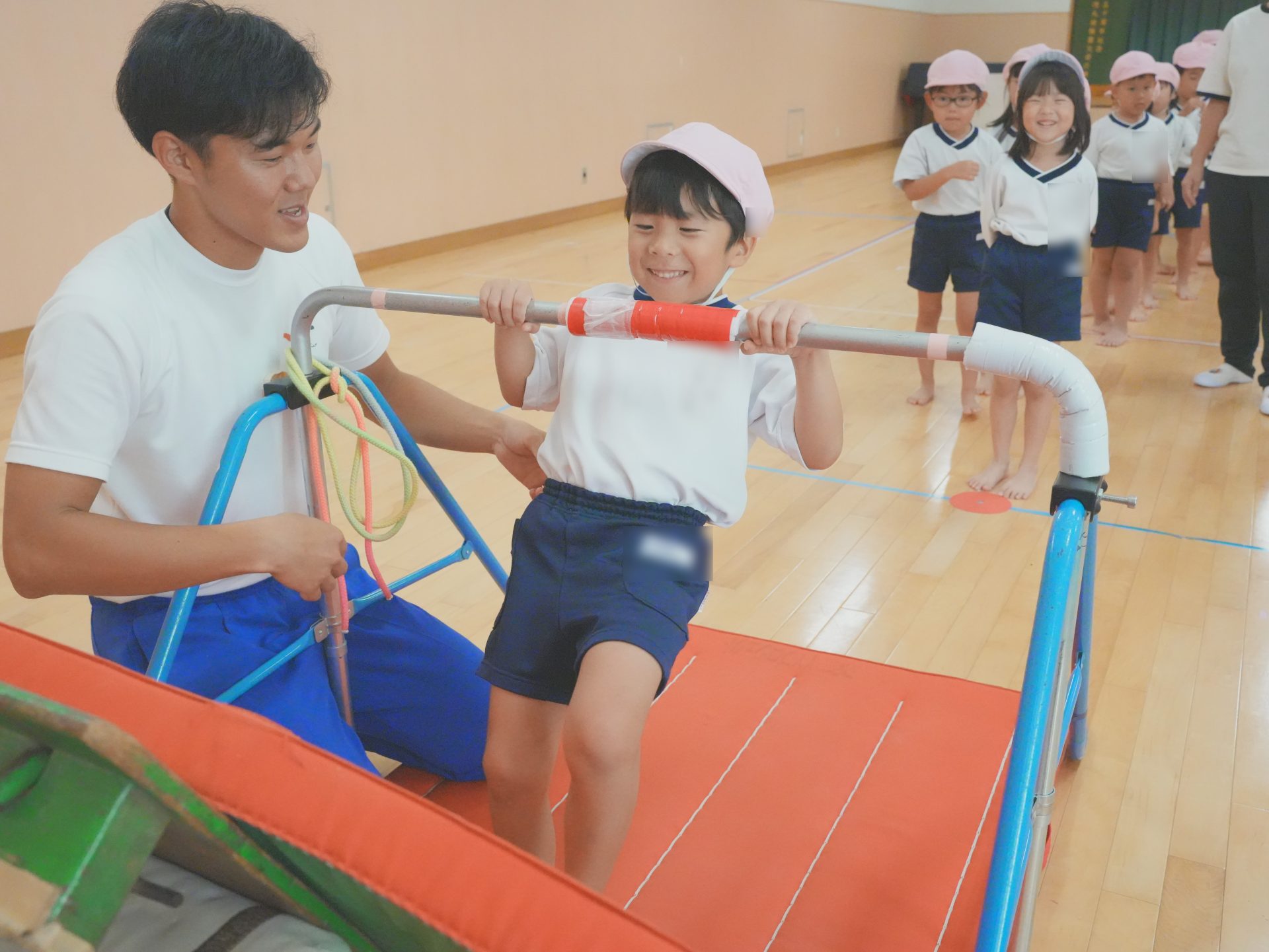 体を動かすことからスタートし、徐々になわとび、跳び箱、でんぐり返し、鉄棒などができるように指導をしていきます。