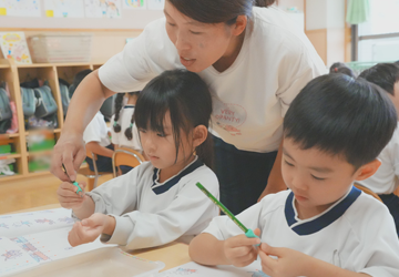 小学校へ入学した時に、全員がひらがなを読んで、書けることを目標としており、文字の意識付けとして『ワークブック』を使って指導をしています。年中組にまずは線を書くことから導入が始まり、年長組では宿題を出したりして進学を見据えて取り組んでいます。